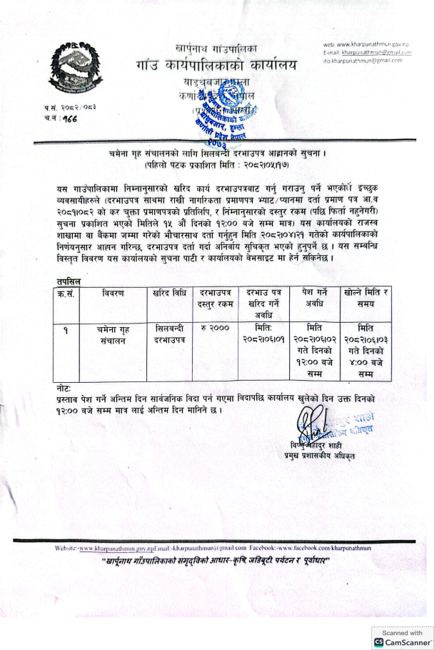चमेना गृह सञ्चालनको लागि सिलबन्दी दरभाउपत्र आह्वान सम्बन्धी सूचना