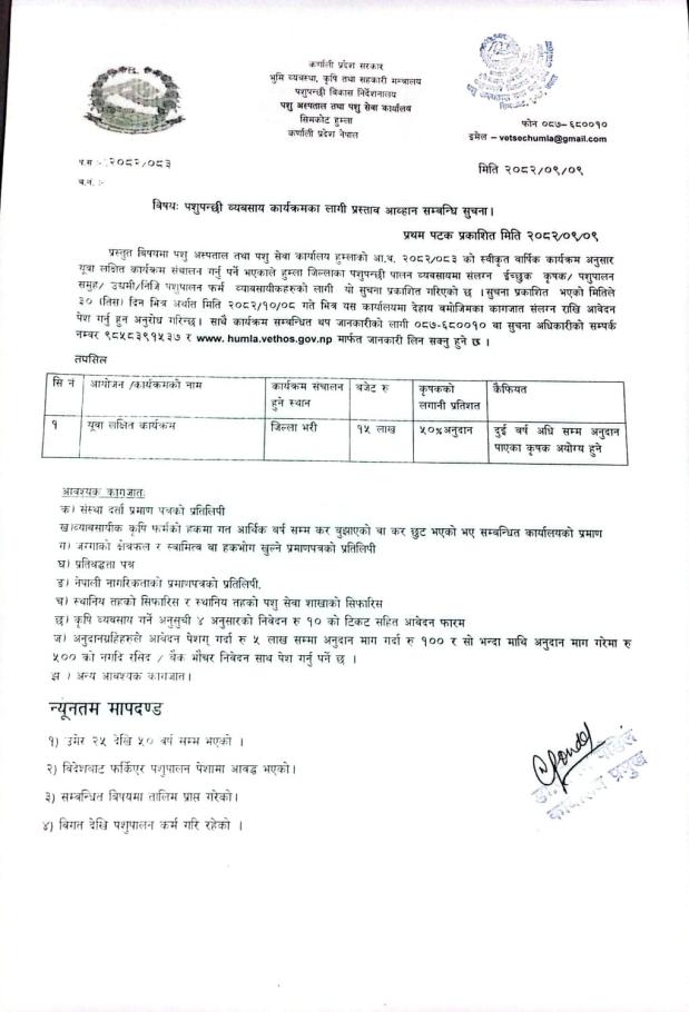 » पशुपन्छी व्यबसाय कार्यक्रमका लागी प्रस्ताव आव्हान सम्बन्धि सुचना ।