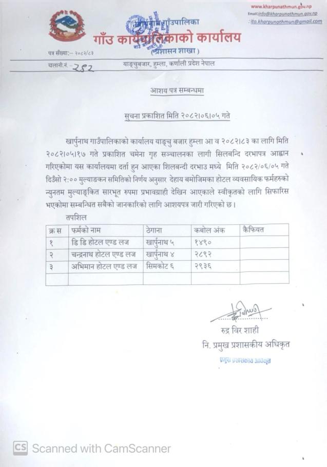 चमेना गृह सञ्चालनको लागि सिलबन्दी दरभाउपत्र आह्वान सम्बन्धी सूचना
