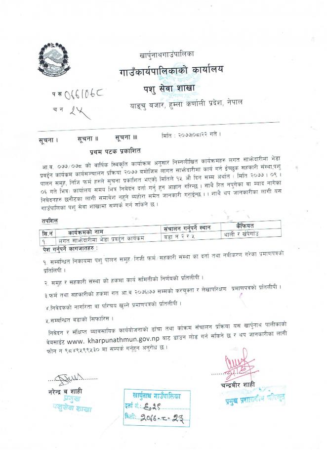 पशुपन्छी व्यबसाय कार्यक्रमका लागी प्रस्ताव आव्हान सम्बन्धि सुचना ।