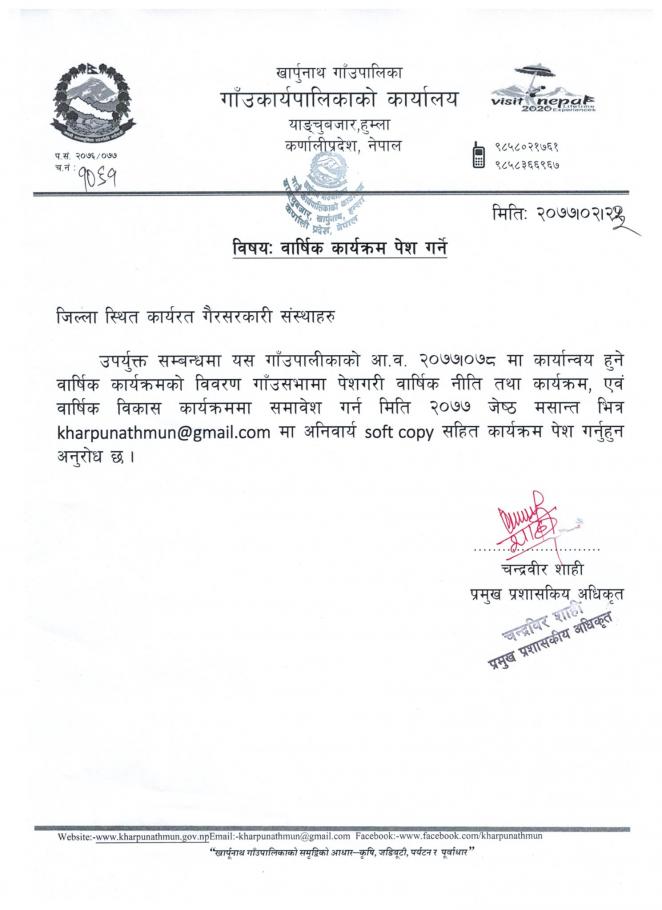 जिल्ला स्थित कार्यरत गैरसरकारी संस्थाहरु सबैलाई वार्षिक कार्यक्रम पेश गर्ने सम्बन्धी सूचना
