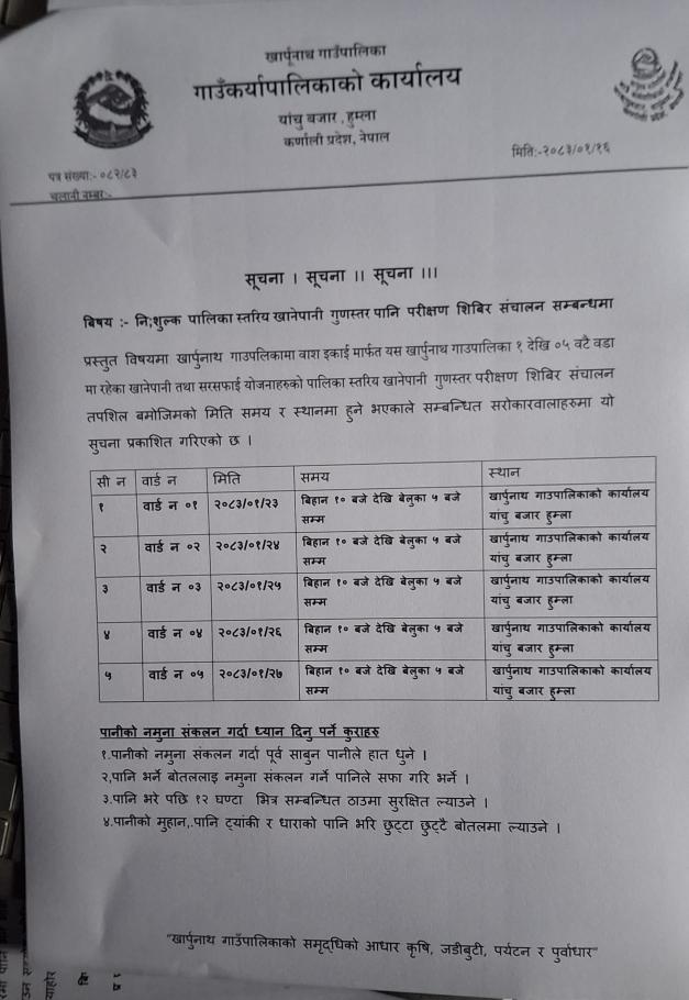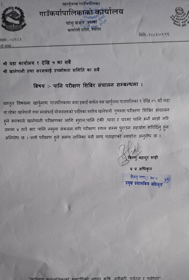 पानी परीक्षण शिविर सञ्चालन सम्बन्धमा |